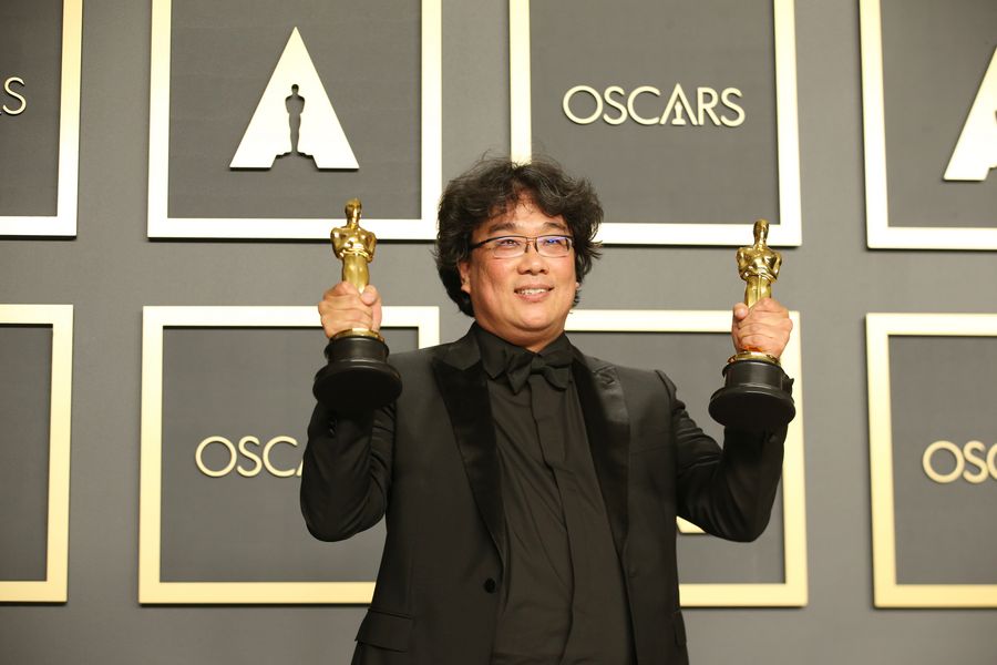 Bong Joon-ho poses for photos at the 92nd Academy Awards ceremony at the Dolby Theatre in Los Angeles, the United States, Feb. 9, 2020. (Xinhua/Li Ying)