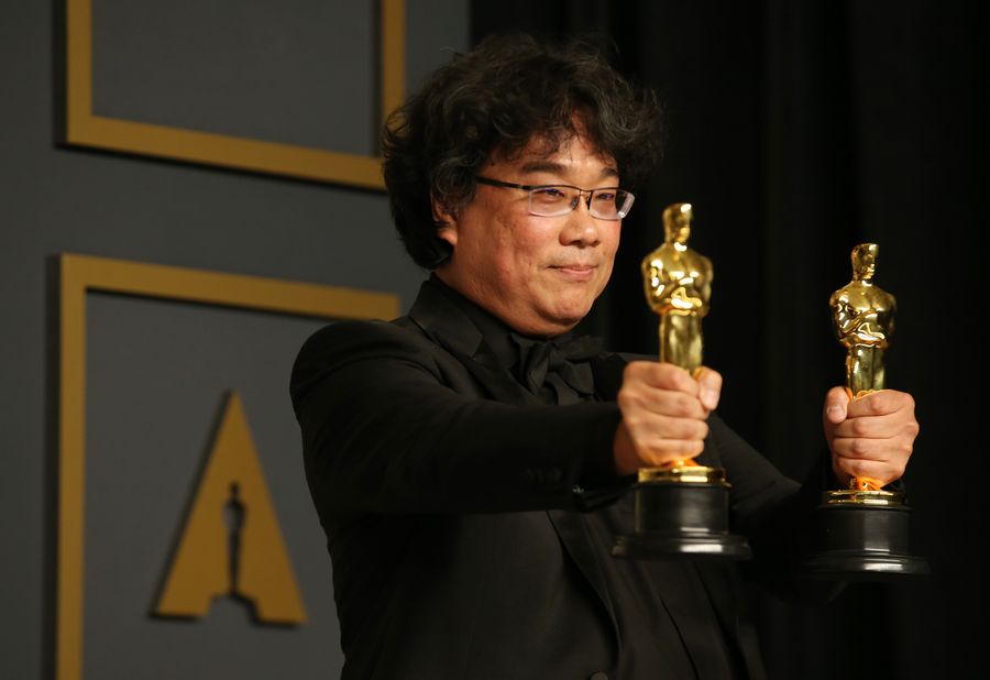 Bong Joon-ho holds the Oscars winned by "Parasite" at the 92nd Academy Awards ceremony at the Dolby Theatre in Los Angeles, the United States, Feb. 9, 2020. (Xinhua/Li Ying)