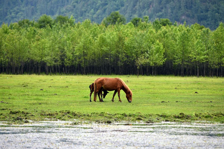 A horse and its foal eat grass at a grassland in Nyingchi Prefecture, southwest China's Tibet Autonomous Region, May 27, 2019. (Xinhua/Li Xin)