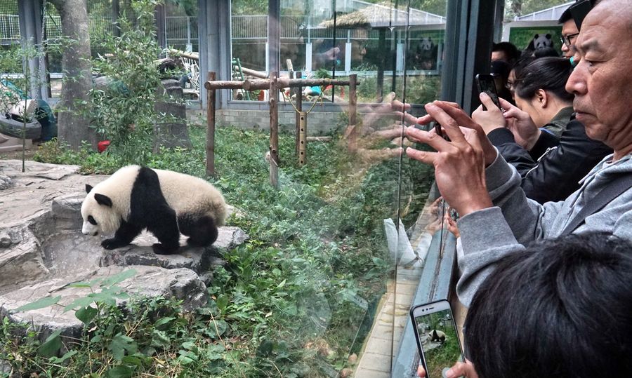 Visitors take photos of giant panda Mengbao at its new home at the Beijing Zoo in Beijing, capital of China, Oct. 13, 2019. (Xinhua/Li Xin)