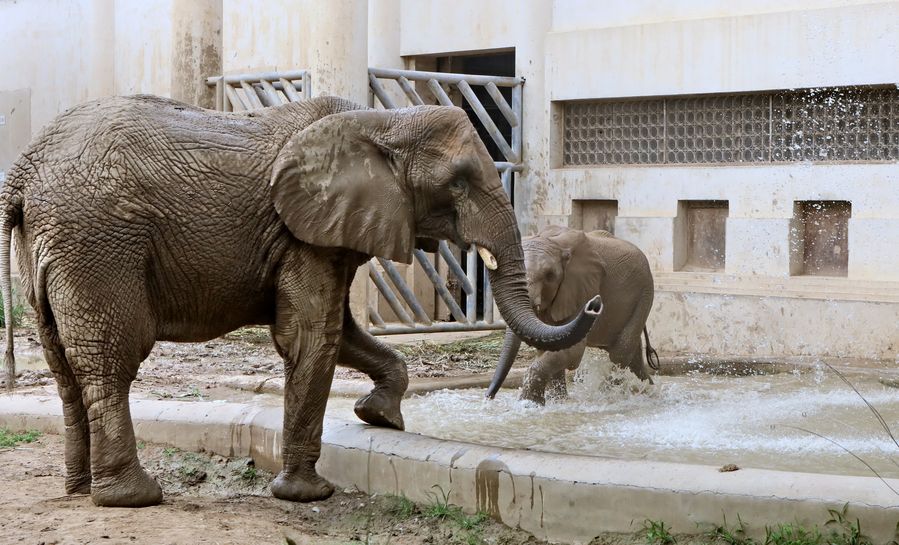 Elephants play in a paddling pool at Beijing Zoo in Beijing, capital of China, July 18, 2019. (Xinhua/Li Xin)