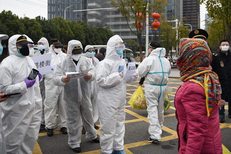 Community workers receive patients who have recovered from novel coronavirus pneumonia in Wuchang District of Wuhan, central China's Hubei Province, Feb. 11, 2020. (Xinhua/Cheng Min)