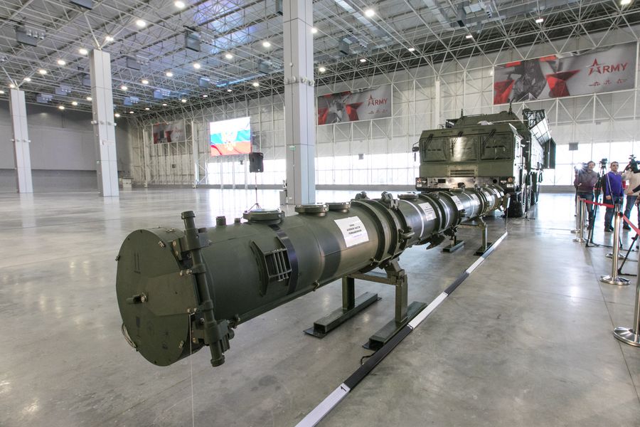 The 9M729 missile container is demonstrated at the Patriot Congress and Exhibition Center, outside Moscow, Russia, on Jan. 23, 2019. (Xinhua/Bai Xueqi)
