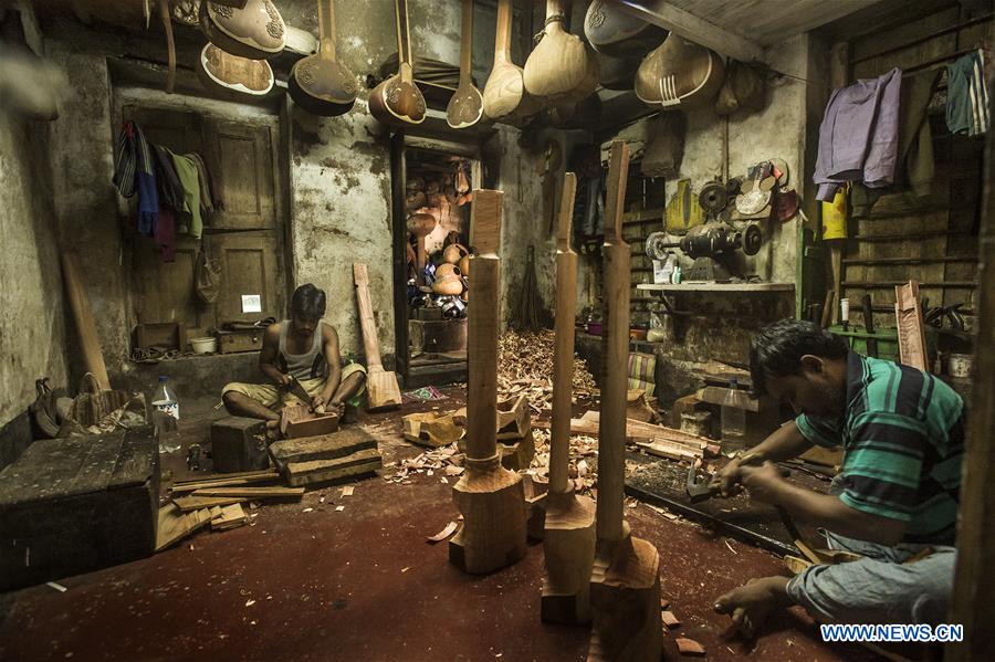 Artisans make string instruments for Indian classical music on the outskirts of Kolkata, India, on Feb. 11, 2020. Many string instruments in Indian classical music feature portions of natural material which give a special sound to the instruments. (Xinhua/Tumpa Mondal)