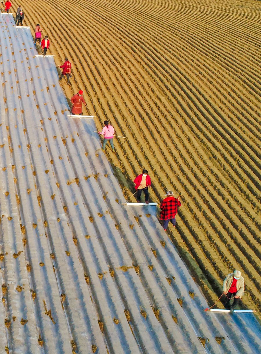 Aerial photo taken on Feb. 11, 2020 shows villagers working in fields in Sangshulin Village, Tuopai Township of Shehong City, southwest China's Sichuan Province. (Photo by Liu Changsong/Xinhua)