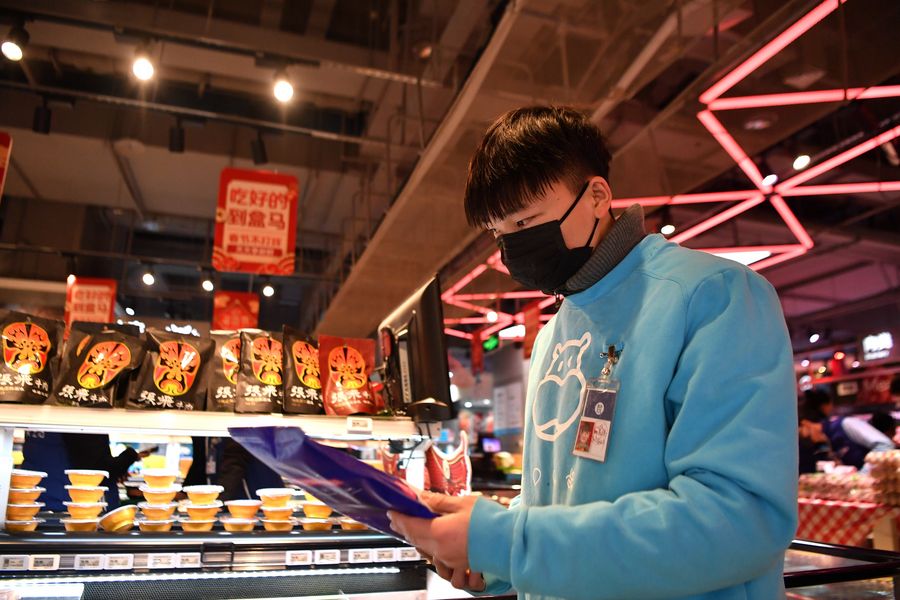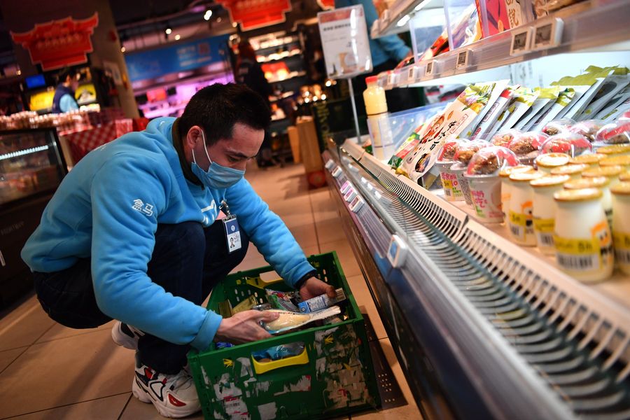 Gao Wei, an employee of Yunhaiyao restaurant in Xi'an City,works at Freshhema supermarket, Feb. 6, 2020. (Xinhua/Zhang Bowen)