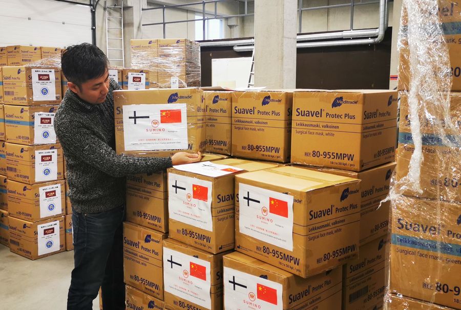 A man checks medical supplies donated to China at a warehouse in Helsinki, Finland, Jan. 31, 2020. (Xinhua/Zhu Haochen)