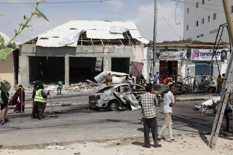 People are seen at the scene of a massive car bomb explosion in Mogadishu, capital of Somalia, Jan. 8, 2020. (Xinhua/Hassan Bashi)