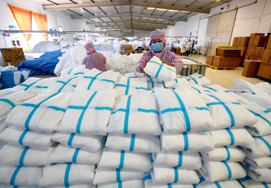 Workers arrange protective suits at a workshop in a company in Ningjin County, north China's Hebei Province, Feb. 12, 2020. (Xinhua/Wang Xiao)