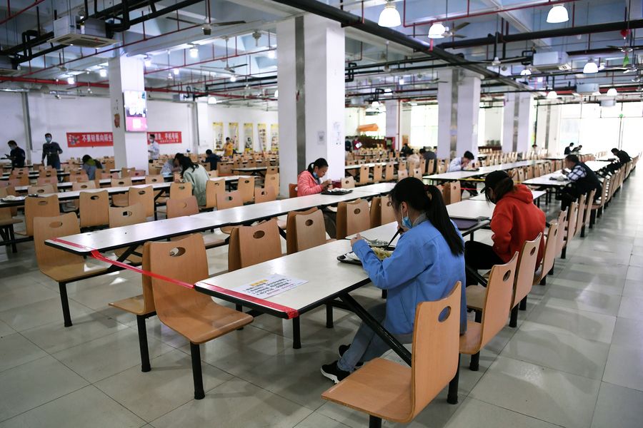 Workers eat at intervals as a way of preventing coronavirus infection at Hytera Industrial Park in Longgang District of Shenzhen, south China's Guangdong Province, Feb. 10, 2020. (Xinhua/Liang Xu)