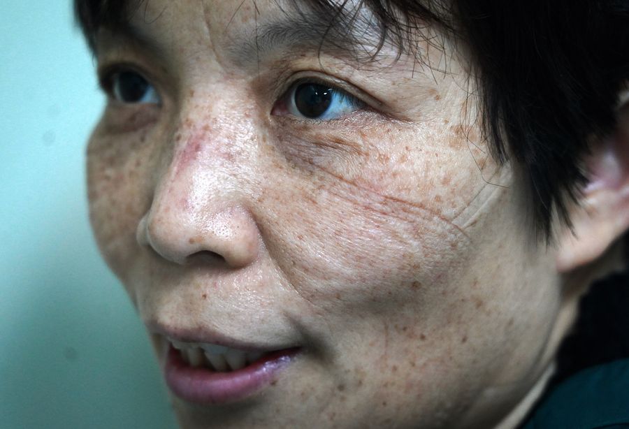 Photo taken on Feb. 6, 2020 shows dents on face of ICU head nurse Jiang Rong left by mask and goggle worn to help prevent infection during coronavirus patients treatment at a branch hospital of the First Affiliated Hospital of Nanchang University in Nanchang, east China's Jiangxi Province. (Xinhua/Wang Xiang)■