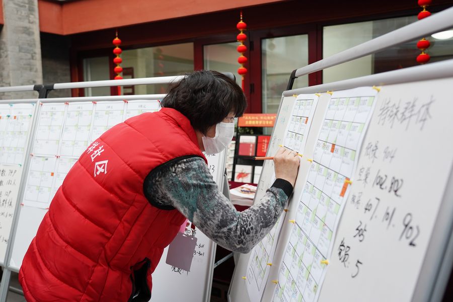 A community staff registers information of residents who have just returned Beijing at Fuxiang community in Dongcheng District in Beijing, capital of China, on Feb. 12, 2020. (Xinhua/Ju Huanzong)