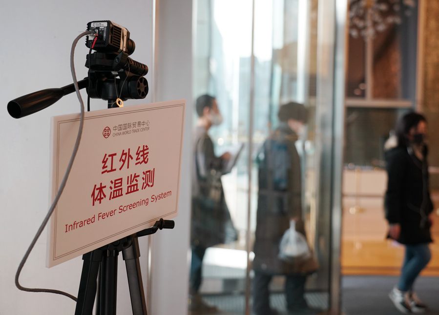 An infrared fever screening system used for checking people's body temperature is seen in the China World Trade Center Tower 3 in Beijing, capital of China, on Feb. 12, 2020. (Xinhua/Zhang Chenlin)