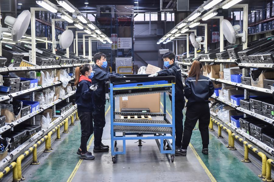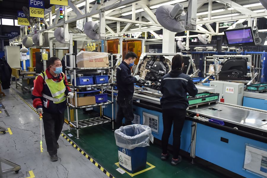 Workers wearing face masks work in a workshop of an automotive company in Beijing, capital of China, on Feb. 12, 2020. (Photo by Peng Ziyang/Xinhua)