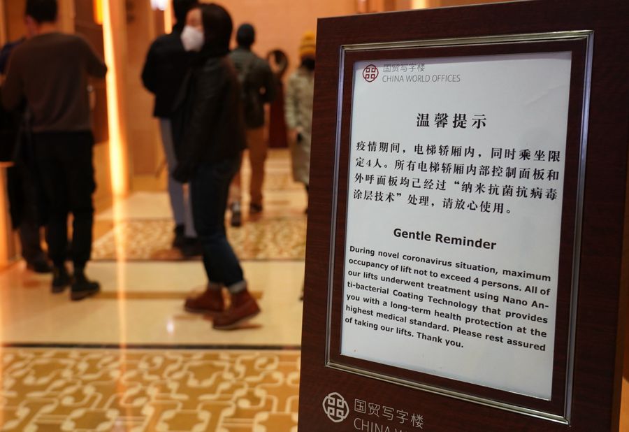 A placard, notifying that the Nano anti-bacterial coating technology is used for panel of the lift, is seen in front of an elevator in the China World Trade Center Tower 3 in Beijing, capital of China, on Feb. 12, 2020. (Xinhua/Zhang Chenlin)