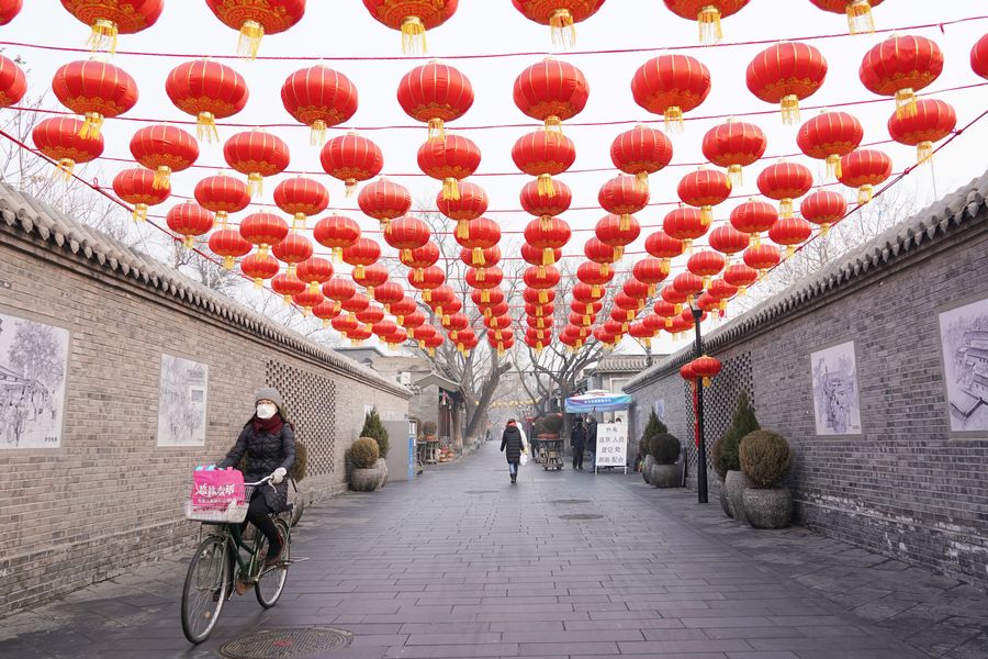 Photo taken on Feb. 12, 2020 shows a view of the South Luogu Lane, a popular tourist spot, in Beijing, capital of China. (Xinhua/Ju Huanzong)