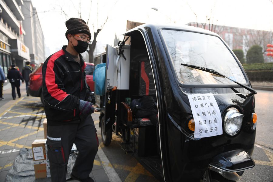 A placard, demonstrating the prevention measures the package delivery company has taken, is seen on the electric tricycle of a deliveryman in Chaoyang District in Beijing, capital of China, on Feb. 12, 2020. (Xinhua/Ju Huanzong)