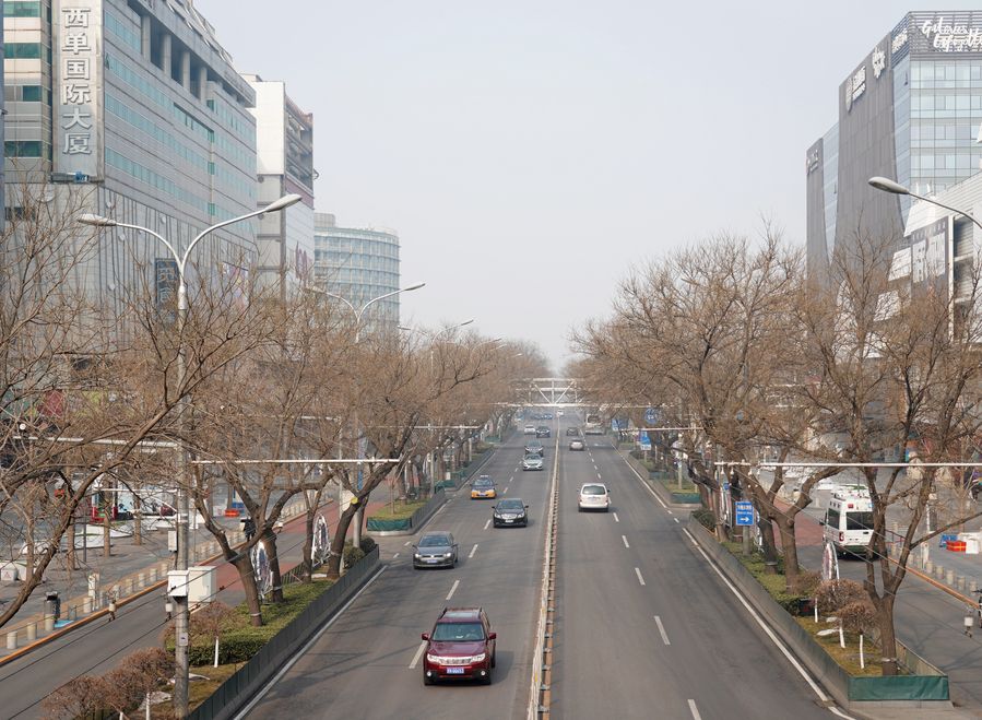 Photo taken on Feb. 12, 2020 shows a street with light traffic in the Xidan business area in Beijing, capital of China, on Feb. 12, 2020. (Xinhua/Zhang Chenlin)