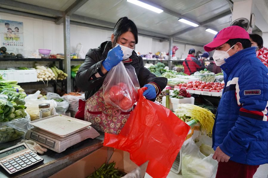 A vendor wearing face mask serves a customer in a vegetable market at Fuxiang community in Dongcheng District in Beijing, capital of China, on Feb. 12, 2020. (Xinhua/Ju Huanzong)