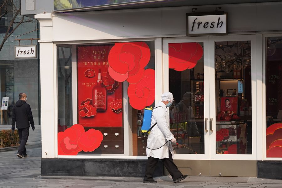 A staff member disinfects the environment at a street in Sanlitun business area in Beijing, capital of China, on Feb. 12, 2020. (Xinhua/Ju Huanzong)■