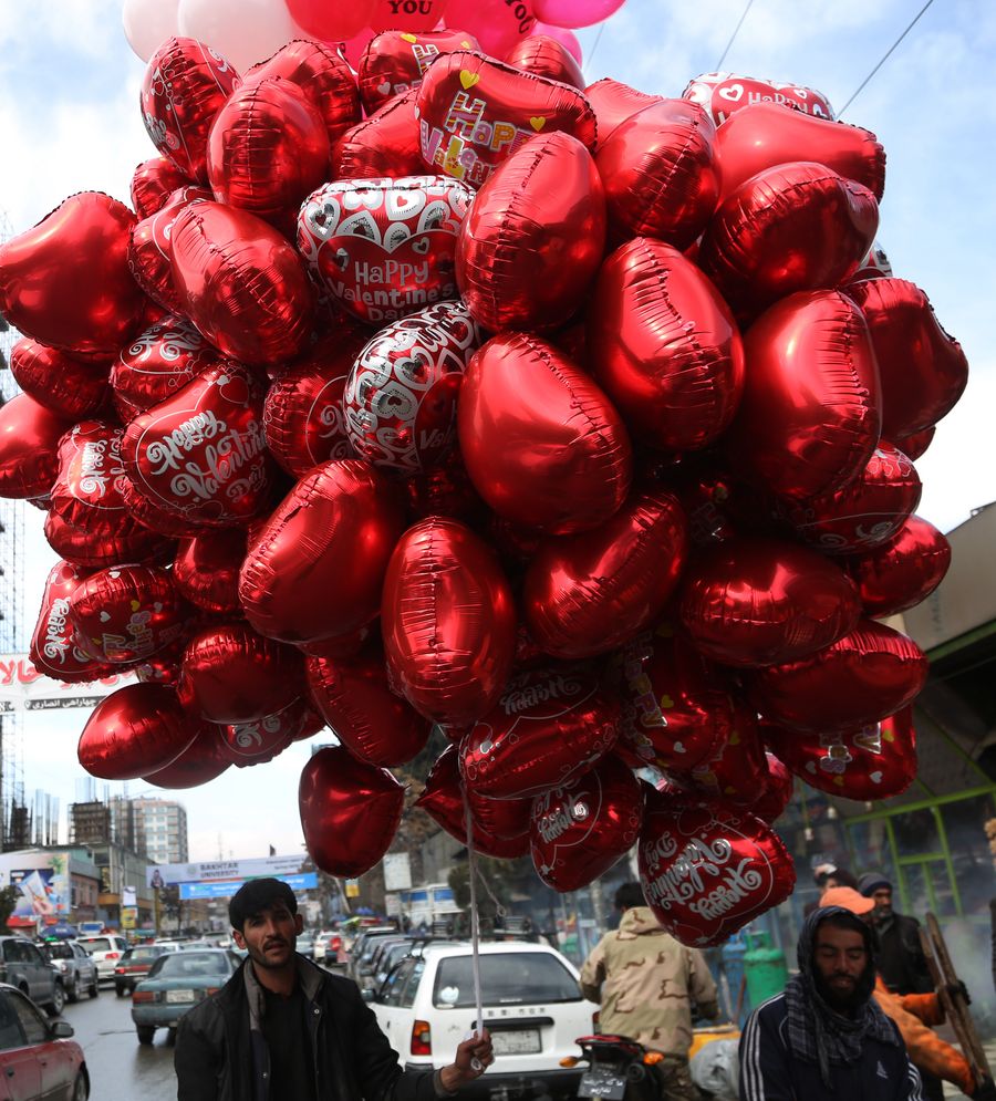 An Afghan man sells heart-shaped balloons ahead of the Valentine's Day in Kabul, capital of Afghanistan, Feb. 13, 2020. (Xinhua/Rahmatullah Alizadah)■