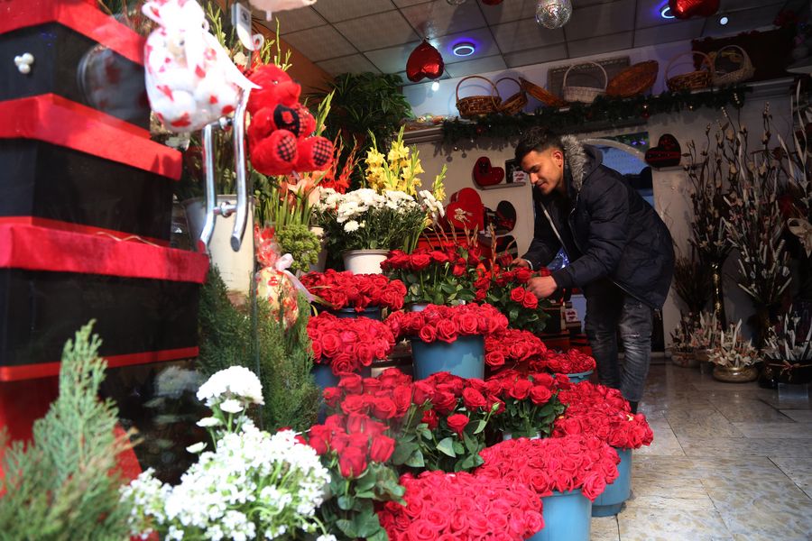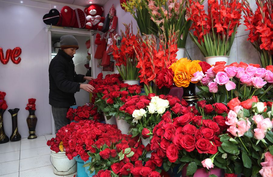 A man prepares flowers ahead of the Valentine's Day at a flower shop in Kabul, capital of Afghanistan, Feb. 13, 2020. (Xinhua/Rahmatullah Alizadah)