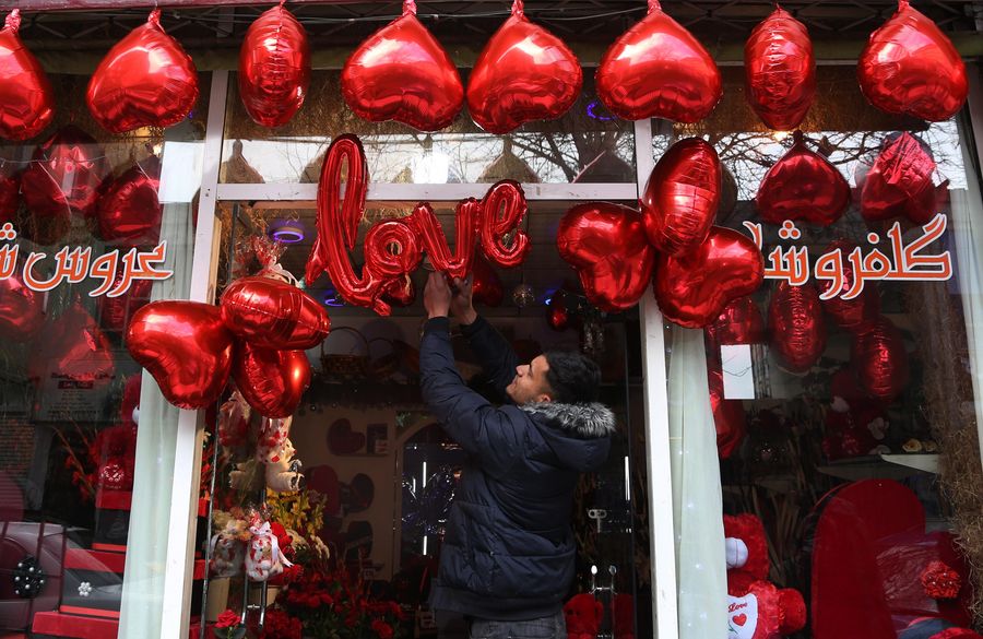 A man decorates a shop with red balloons ahead of the Valentine's Day in Kabul, capital of Afghanistan, Feb. 13, 2020. (Xinhua/Rahmatullah Alizadah)