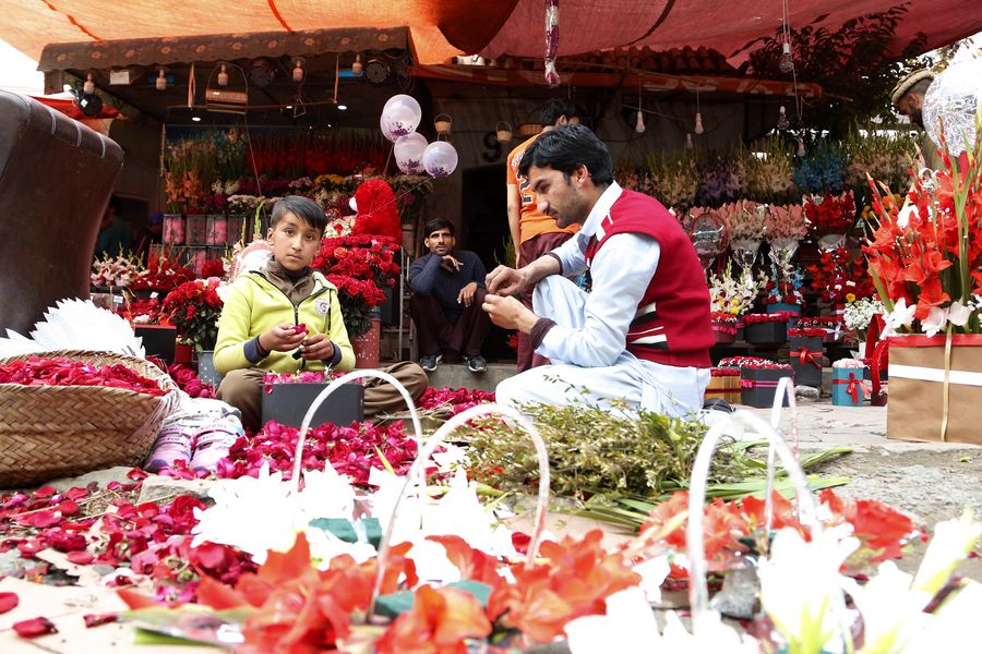 A vendor (R) makes flower decorations at a flower market before Valentine's Day in Islamabad, Pakistan, Feb. 13, 2020. (Xinhua/Ahmad Kamal)■