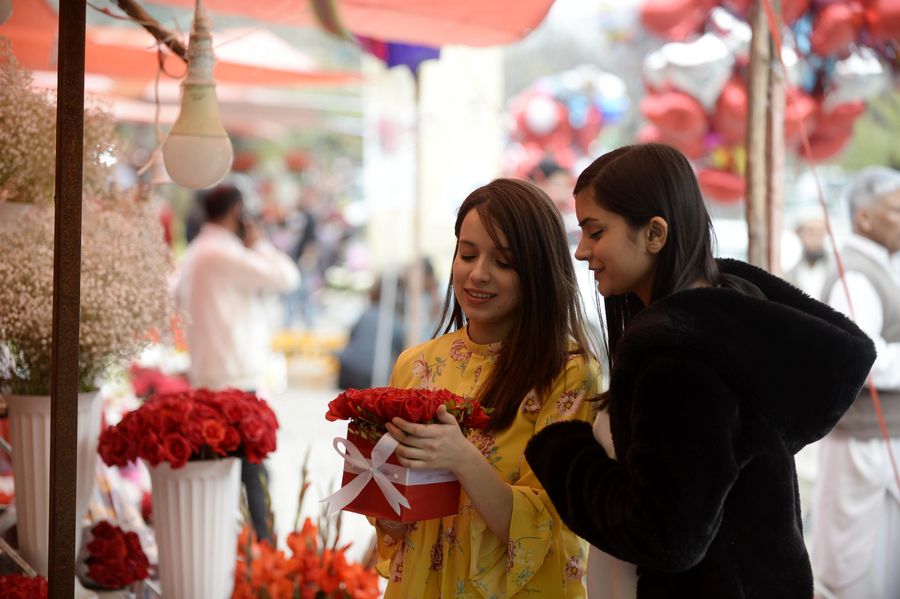 Girls buy flowers before Valentine's Day in Islamabad, Pakistan, Feb. 13, 2020. (Xinhua/Ahmad Kamal)