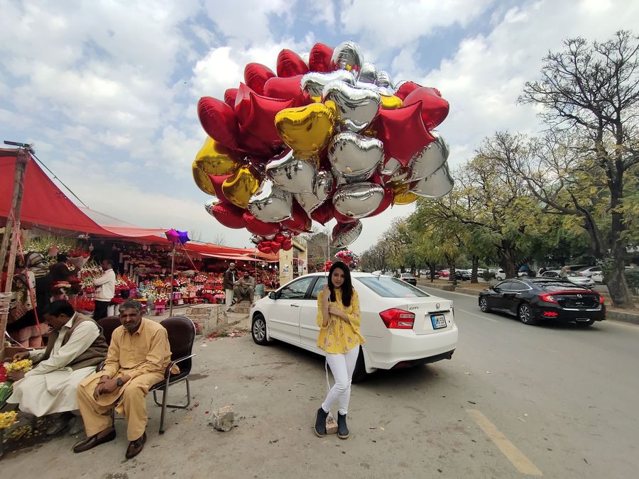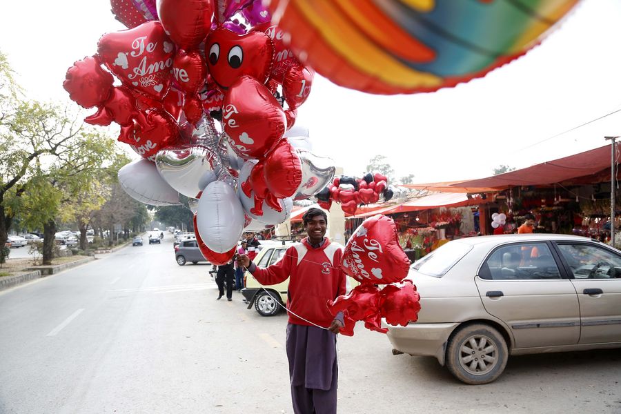 A vendor sells balloons before Valentine's Day in Islamabad, Pakistan, Feb. 13, 2020. (Xinhua/Ahmad Kamal)