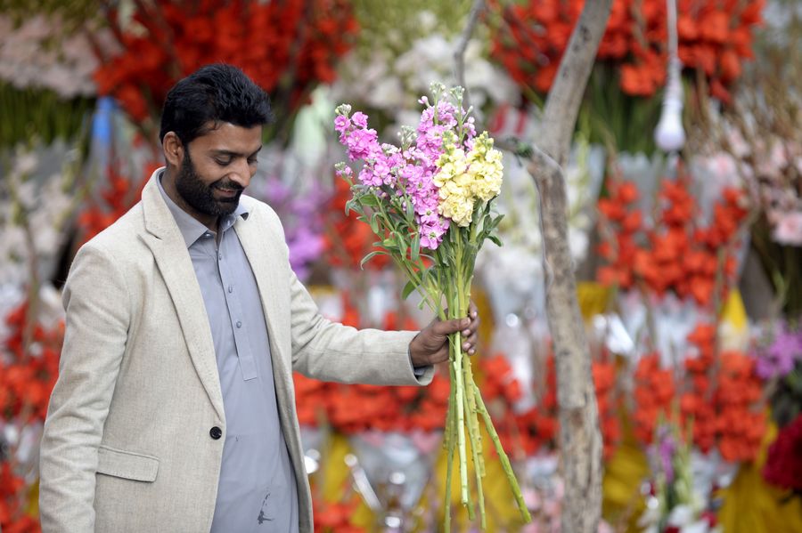 A man holds flowers at a flower market before Valentine's Day in Islamabad, Pakistan, Feb. 13, 2020. (Xinhua/Ahmad Kamal)