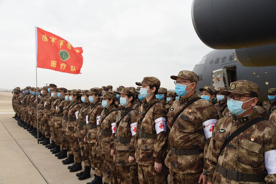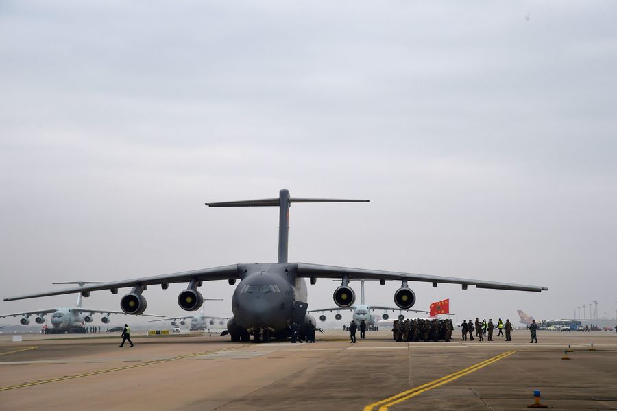 Military medics airlifted by the transport aircraft Y-20 of the People's Liberation Army (PLA) Air Force arrive at Tianhe International Airport in Wuhan, central China's Hubei Province, Feb. 13, 2020. (Xinhua/Li Yun)