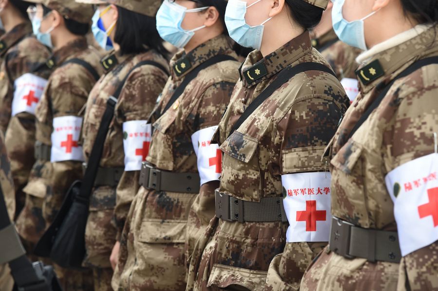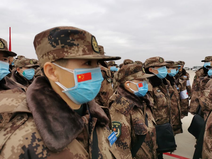 Military medics arrive at Tianhe International Airport in Wuhan, central China's Hubei Province, Feb. 13, 2020. (Xinhua/Li Yun)