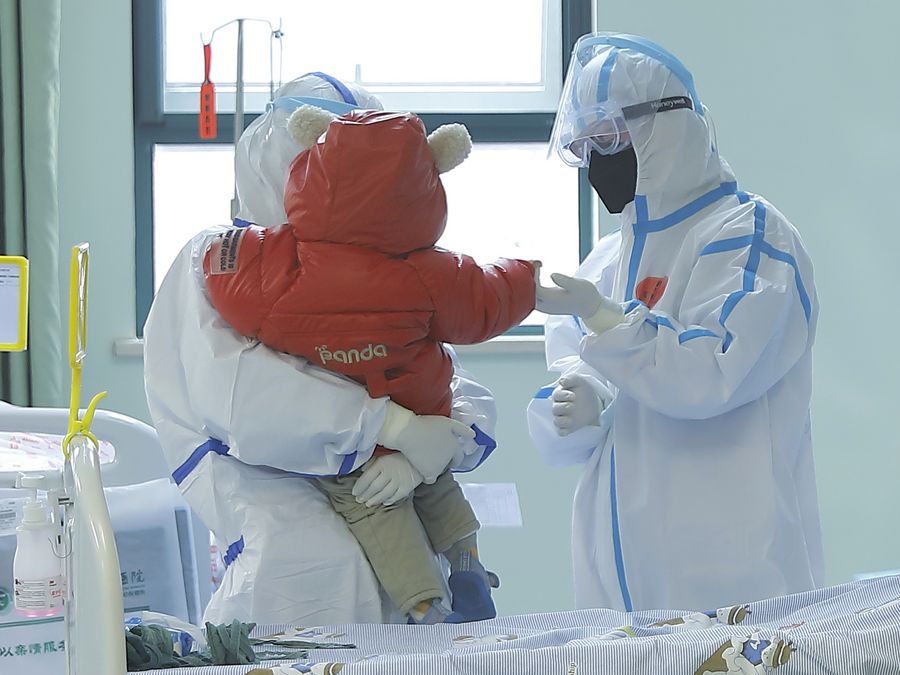 A medical staff holds a 14-month-old baby recovered from novel coronavirus pneumonia before his discharge from the Wuhan Children's Hospital in Wuhan, capital of central China's Hubei Province, Feb. 13, 2020. (Photo provided to Xinhua by Wuhan Children's Hospital)