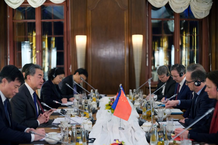 Chinese State Councilor and Foreign Minister Wang Yi (2nd L) and German Foreign Minister Heiko Maas co-chair the fifth round of China-Germany Strategic Dialogue on Diplomatic and Security Affairs in Berlin, capital of Germany, Feb. 13, 2020. (Xinhua/Wang Qing)