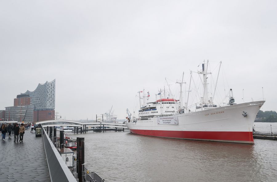 Photo taken on May 21, 2019 shows a ship anchored at the port area of Hamburg, Germany, on May 21, 2019. (Xinhua/Shan Yuqi)