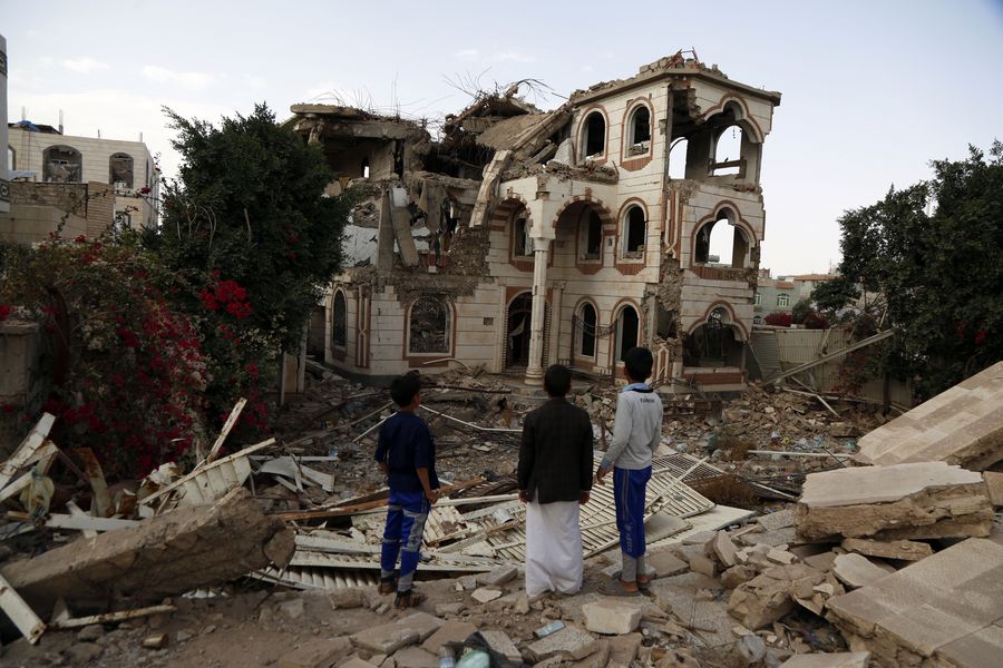 Children stand on rubble of a destroyed building in Sanaa, Yemen, Feb.14, 2020. (Xinhua/Mohammed Mohammed)
