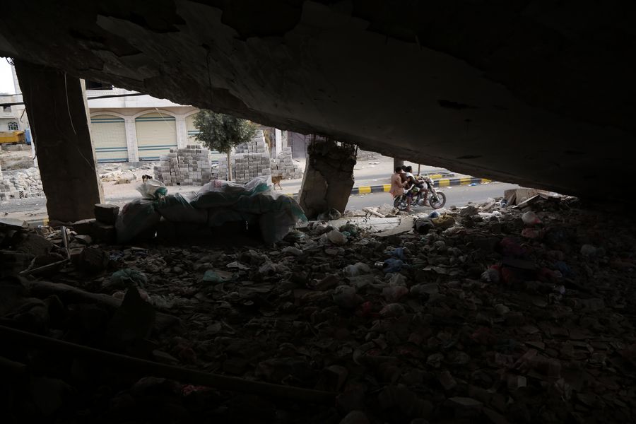 People ride a motorcycle past a destroyed building in Sanaa, Yemen, Feb.14, 2020. (Xinhua/Mohammed Mohammed)