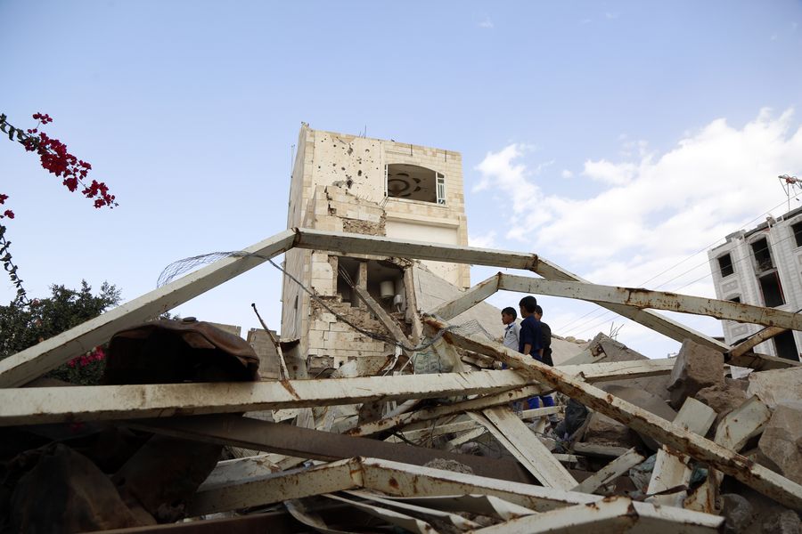 Children stand on rubble of a destroyed building in Sanaa, Yemen, Feb.14, 2020. (Xinhua/Mohammed Mohammed)■
