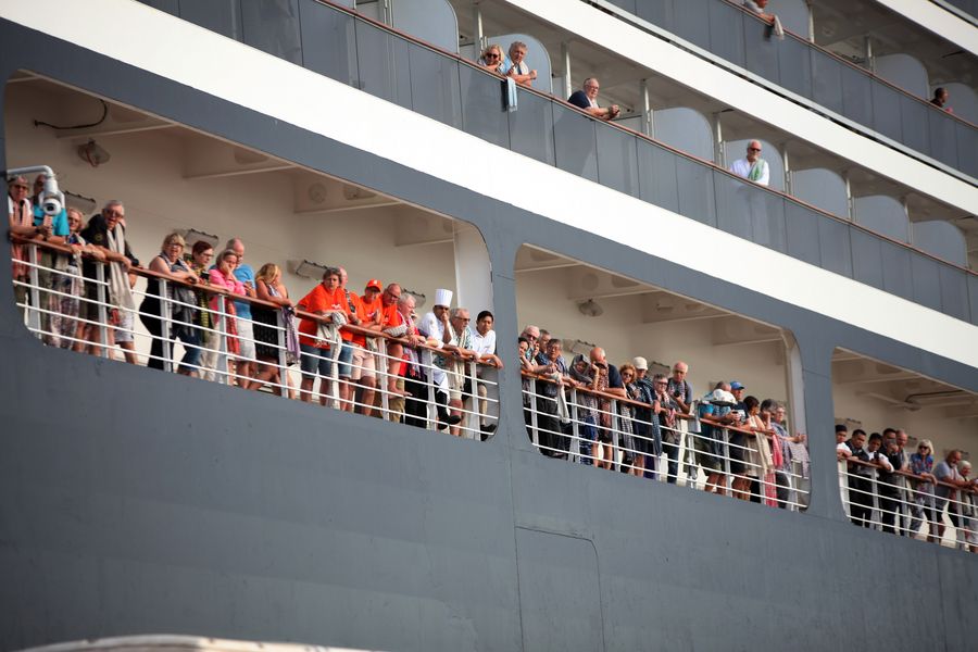 Passengers gather on decks of the Westerdam cruise ship at southwest Cambodia's sea port of Sihanoukville on Feb. 14, 2020. (Photo by Li Lay/Xinhua)