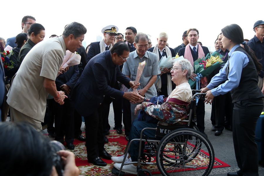 Cambodian Prime Minister Samdech Techo Hun Sen welcomed passengers disembarking from the ship at the PAS on Friday by shaking their hands and presenting each of them a red rose.