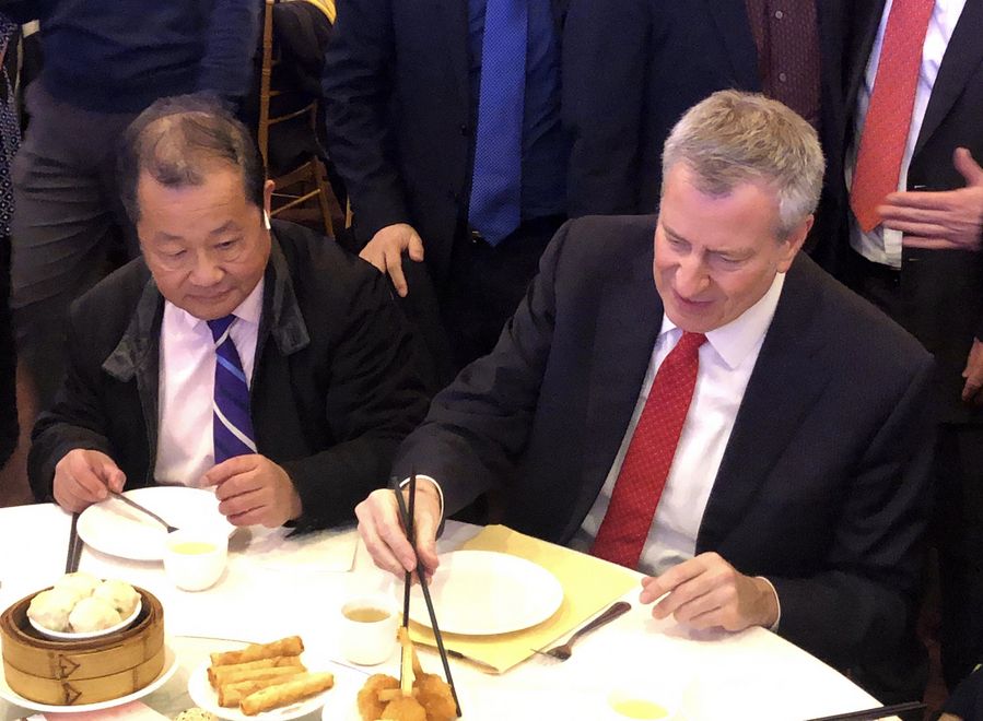 Bill de Blasio (R), mayor of New York City, eats Chinese food at a Chinese restaurant in New York, the United States, on Feb. 13, 2020. (Photo by Zhang Fan/Xinhua)