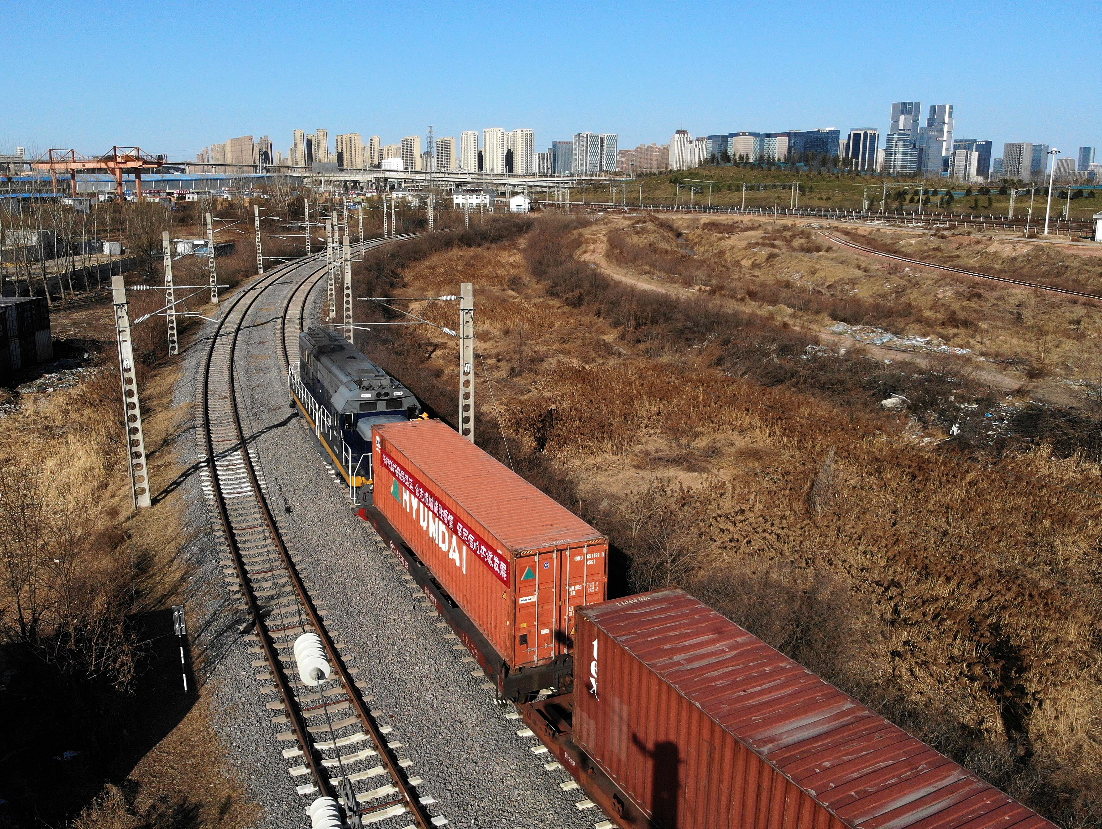 Aerial photo taken on Feb. 16, 2020 shows a China-Europe freight train departing from Zhengzhou Station, central China's Henan Province. (Xinhua/Li An)