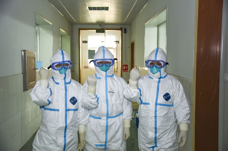 Cao Ting (C) and her colleagues cheer themselves up before entering the laboratory of Xiaogan's center for disease control and prevention in central China's Hubei Province, Feb. 14, 2020. (Xinhua/Hu Huhu)