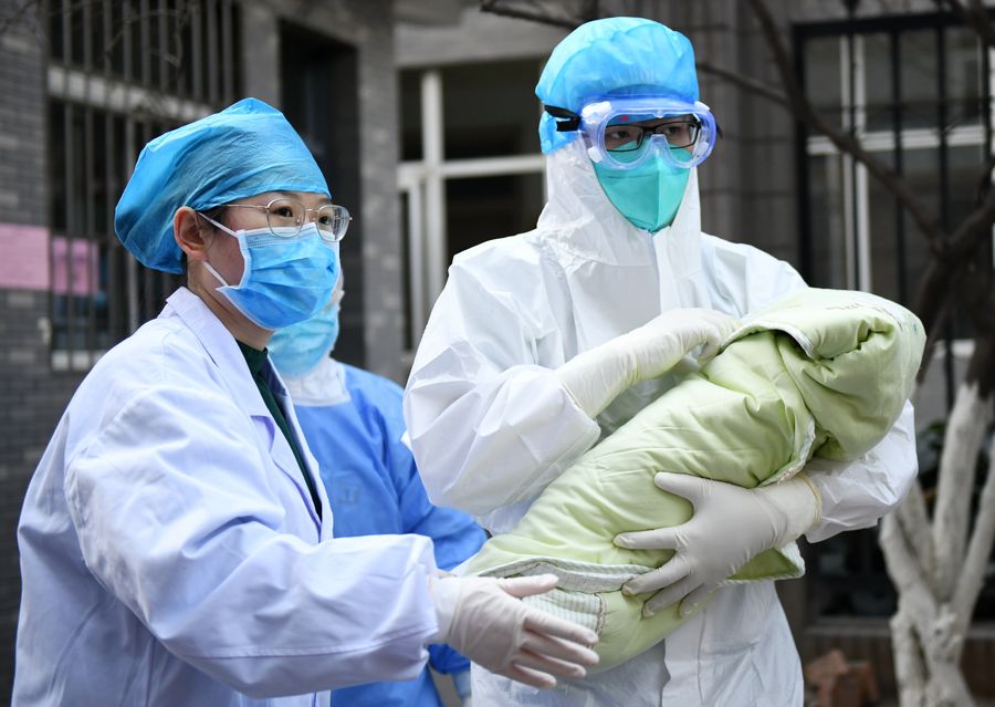 Medical workers hold the baby girl with no infection born by a woman infected with novel coronavirus pneumonia at the Second Affiliated Hospital of Xi'an Jiaotong University in Xi'an, capital of northwest China's Shaanxi Province, Feb. 15, 2020. (Xinhua/Li Yibo)
