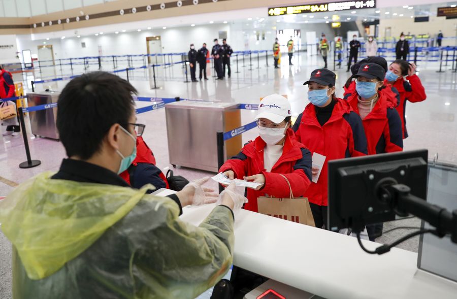 Medical team members check in at Chongqing Jiangbei International Airport in southwest China's Chongqing, Feb. 15, 2020. (Photo by Huang Wei/Xinhua)