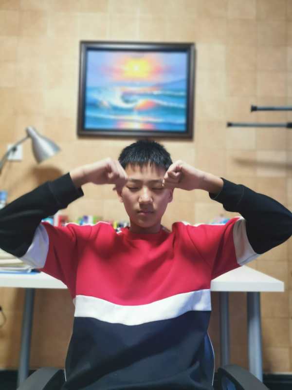 A student does eye exercises at home between online classes in Beijing. (Photo provided to Xinhua)