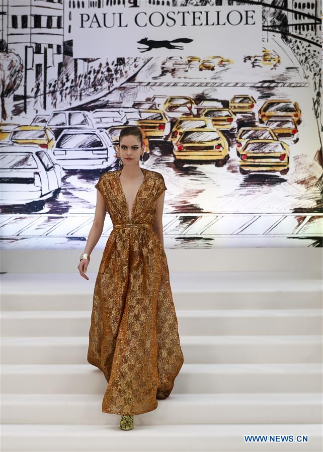 A model walks the runway during the Paul Costelloe catwalk show at London Fashion Week in London, Britain, Feb. 17, 2020. (Xinhua/Han Yan)