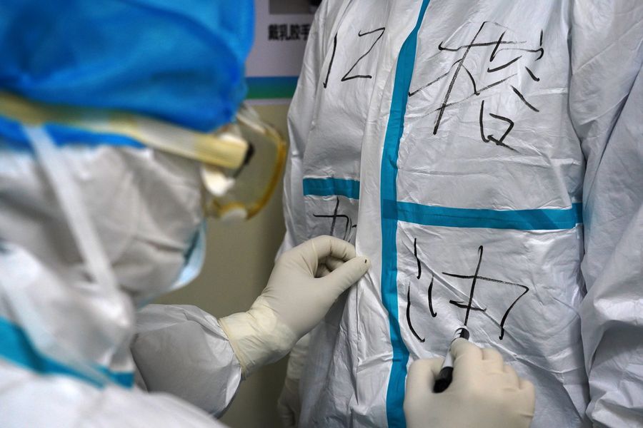 A Doctor writes name on his colleague's suit at Xianghu Hospital of the First Affiliated Hospital of Nanchang University in Nanchang, east China's Jiangxi Province, Feb. 5, 2020. (Xinhua/Wan Xiang)