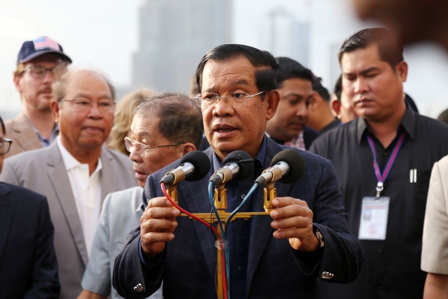 Cambodian Prime Minister Samdech Techo Hun Sen speaks as he greets passengers onboard the Westerdam cruise ship at southwest Cambodia's sea port of Sihanoukville on Feb. 14, 2020. (Photo by Li Lay/Xinhua)
